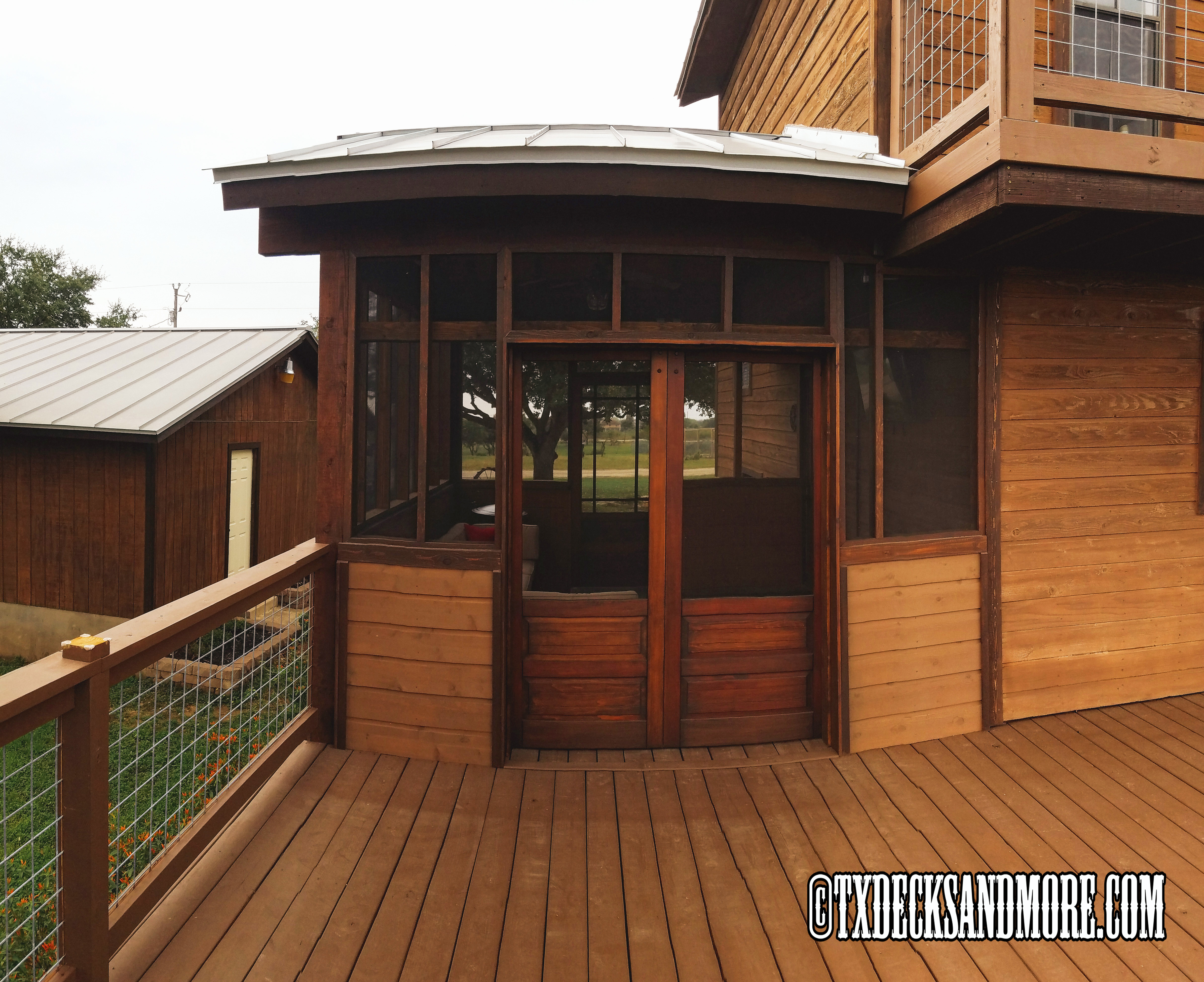 When we built the new deck on this gorgeous home with a spectacular view, the client asked us to create a screened in space for bug-free, rain proof comfort. This cozy space is 15'x13' with fan, lights, and finished ceiling.